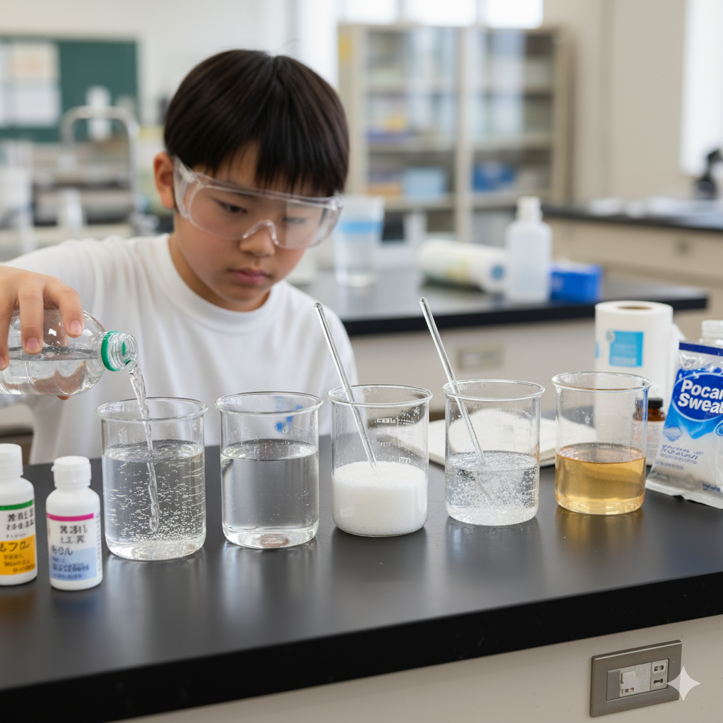 電流が流れる水溶液の実験は、中学2年生で習った電流の流れや中学1年生で習った水溶液の性質など、これまでの学習の継続となる実験です。