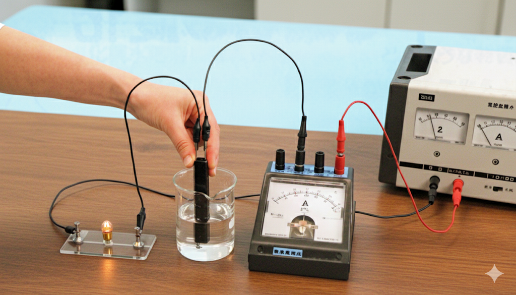 この実験では、水に溶けている物質によって、電流が流れるかどうか決まります。